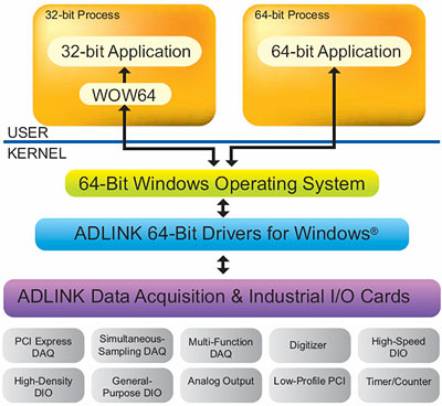 64-bit CPUs continue to make their way to mainstream personal computers in the form of AMD64/Intel x86-64 processor architectures. The emergence of the 64-bit architecture effectively improves performance and scalability by processing more data per clock cycle, addressing more memory, and running faster numeric calculations. ADLINK delivers 64-bit kernel drivers for all its data acquisition cards to let you experience with the benefits of 64-bit operation, improve performance and increase productivity of your current application.