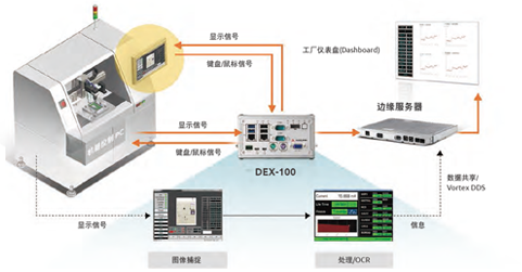 凌华科技DEX-100以单一解决方案,服务多种基于PC的机台设备类型,利用内建的光学字符识别(OCR)功能,将各种采用不同协议的机台设备,整合而为一种采集方式,通过VGA/DVI输出,将各种设备协议整合至单一标准的、可扩展的接口。